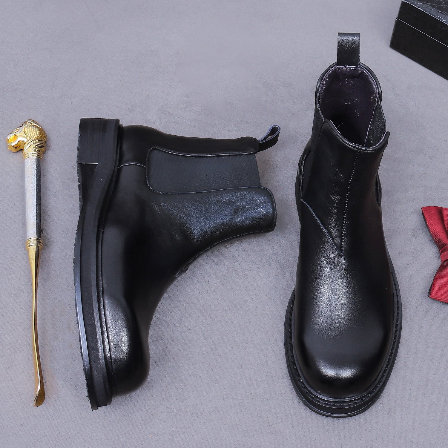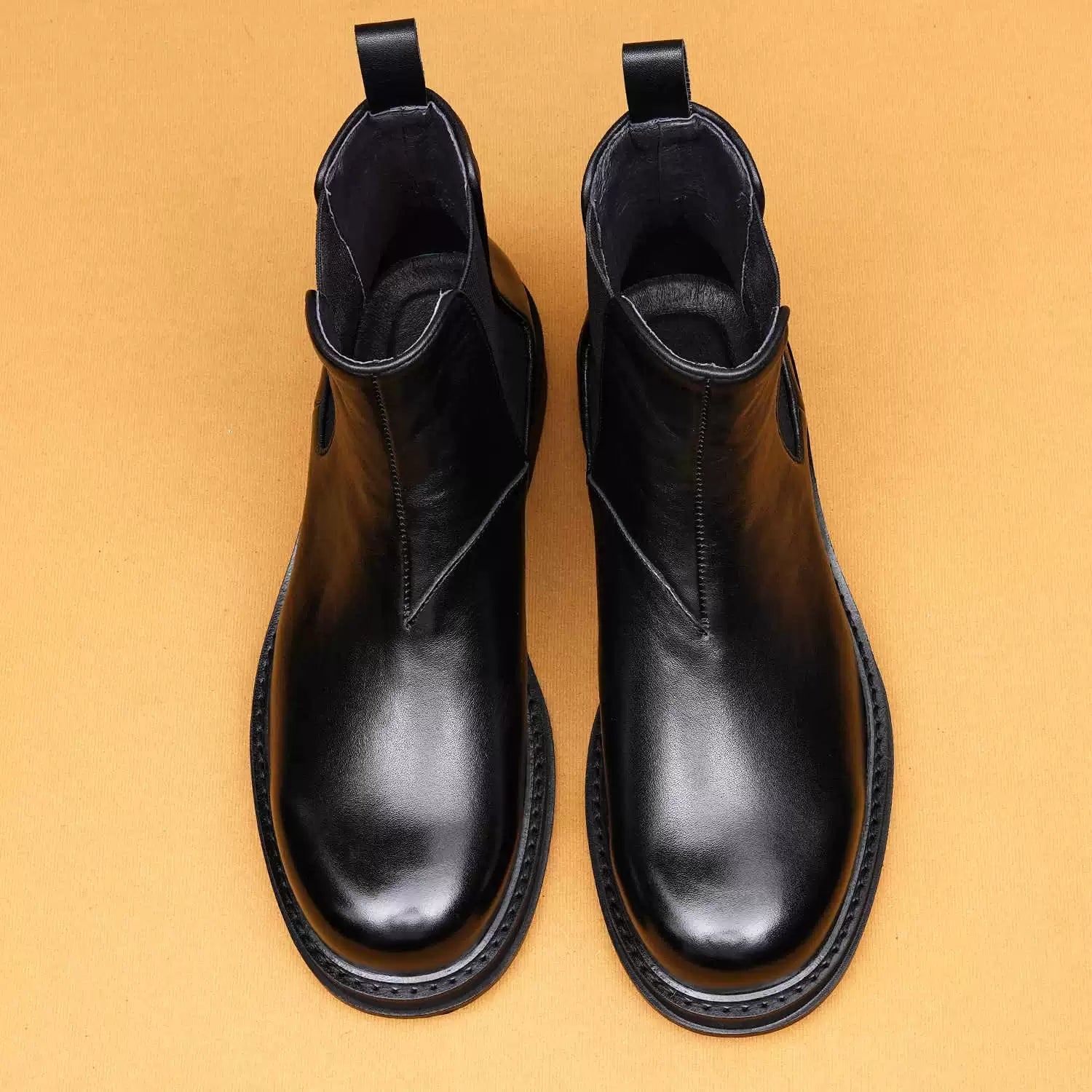 Need warm, stylish boots for winter days? These genuine leather Chelsea boots feature a thick sole, elastic side panels, and classic British retro design. Perfect for casual or smart outings—cozy, easy to wear, and versatile, blending winter comfort with timeless flair.