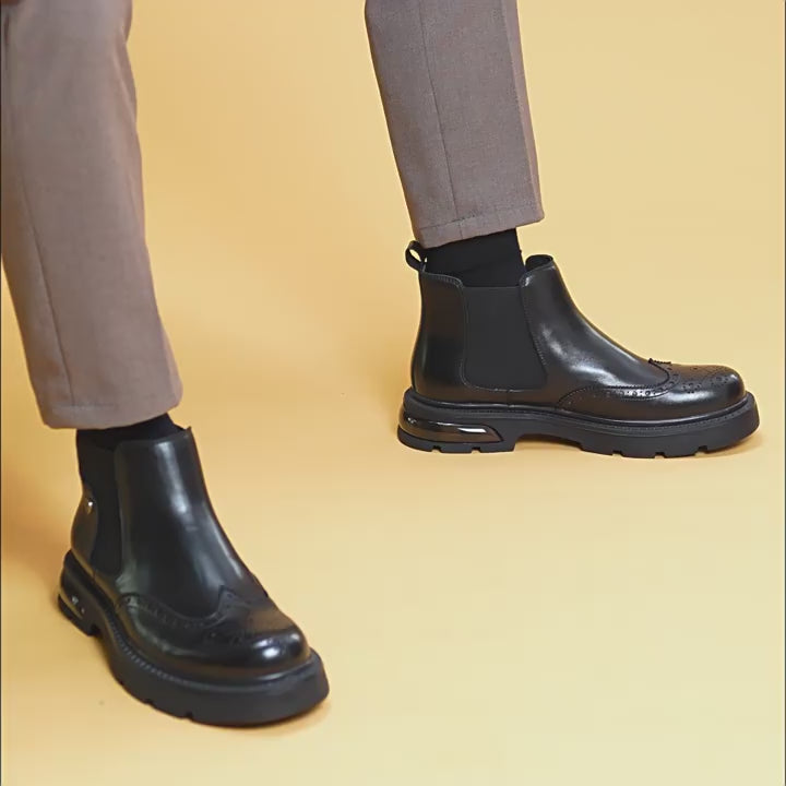 Chaussures en cuir de vachette de première couche pour hommes, bottes Chelsea d'hiver en cuir pour hommes, chaussures d'affaires décontractées à plateforme à coussin d'air, style britannique, brogue sculpté66297