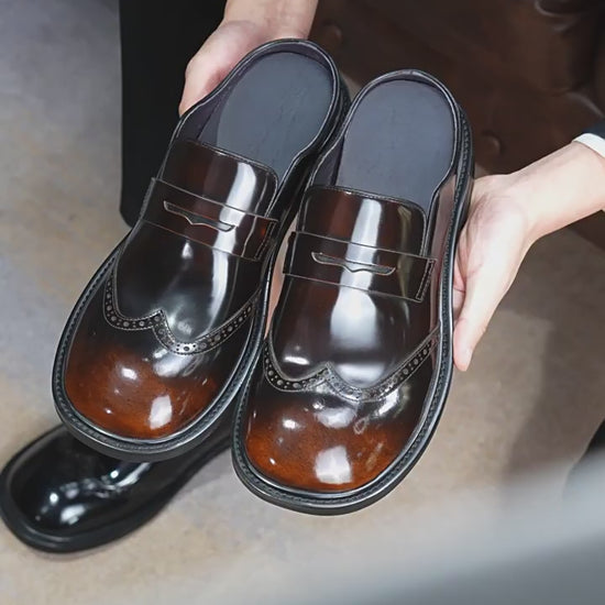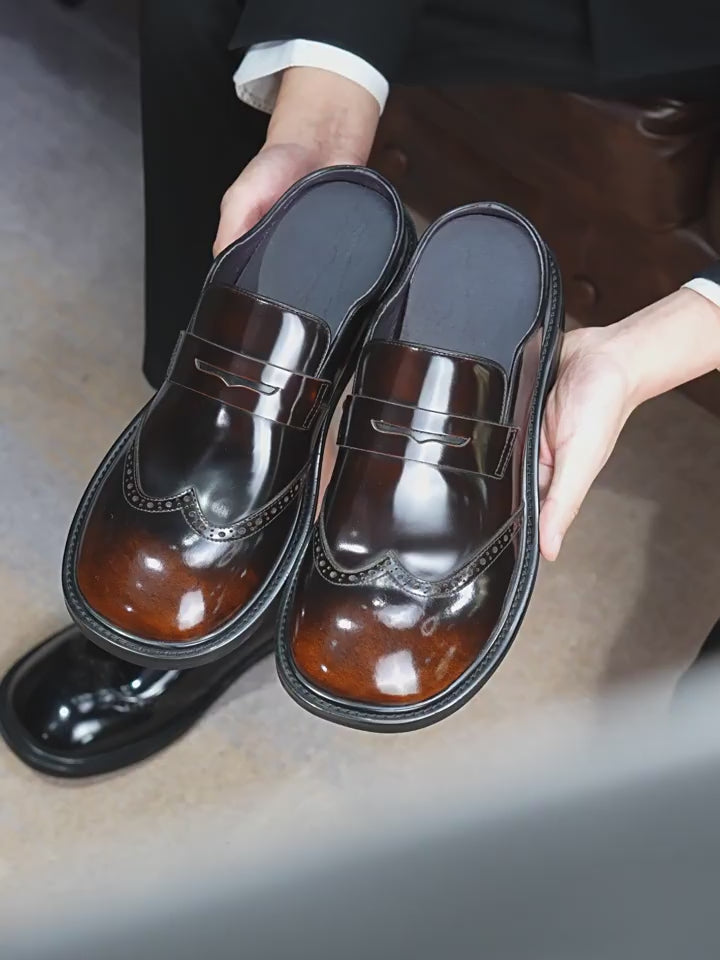 Large Round Toe Men's Shoes Flat Toe Men's British Business Casual Cowhide Genuine Leather Shoes Half Slip-on British Wide Foot Men's Shoes 23710