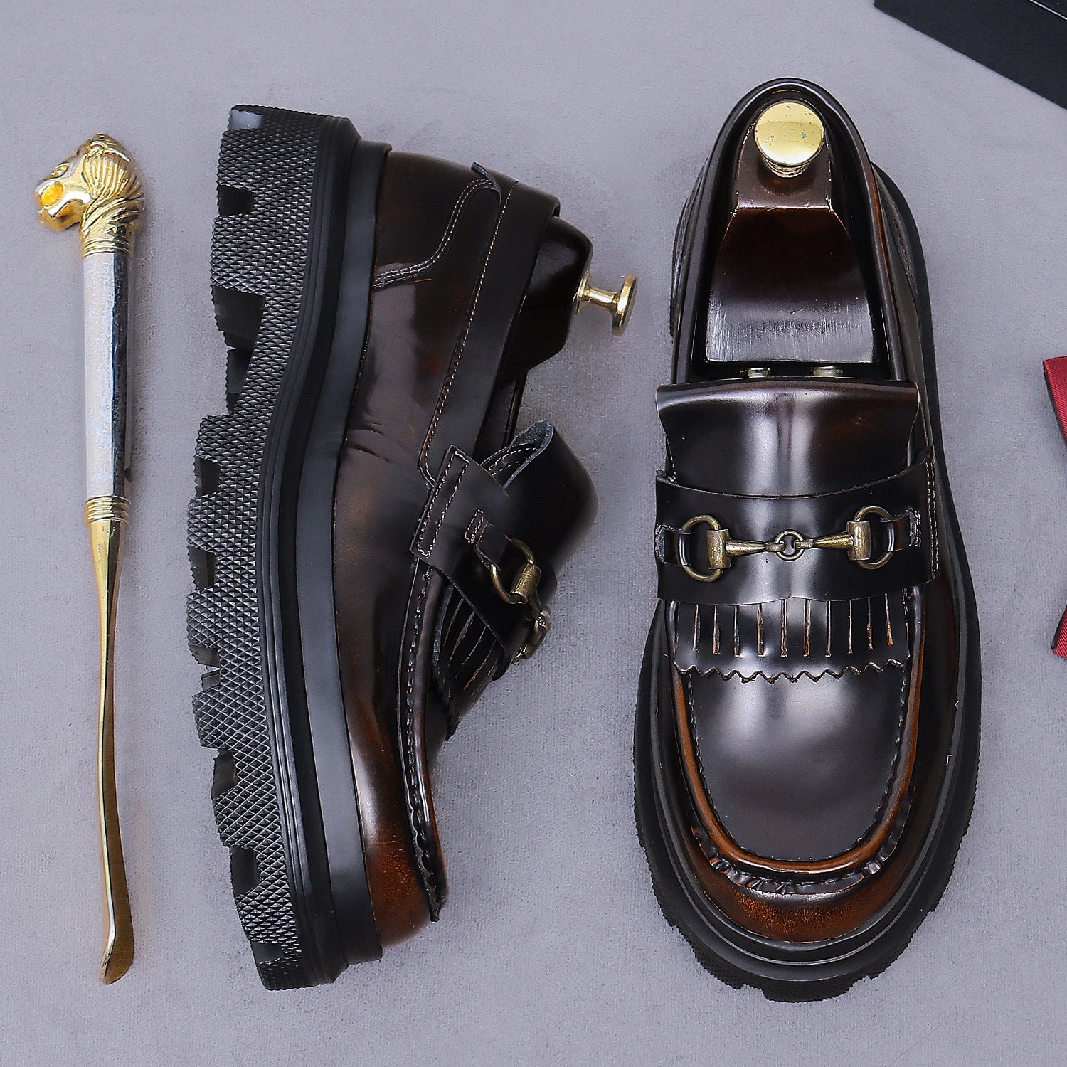 Want stylish shoes that add subtle height? These genuine leather loafers feature a thick elevator sole, metallic accents, and slip-on design. Perfect for business or casual outings—polished, comfortable, and discreetly elevated, blending British flair with daily versatility.